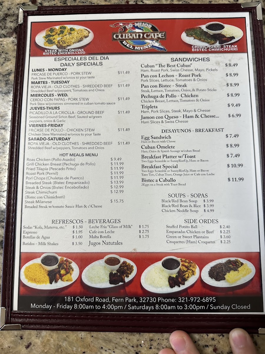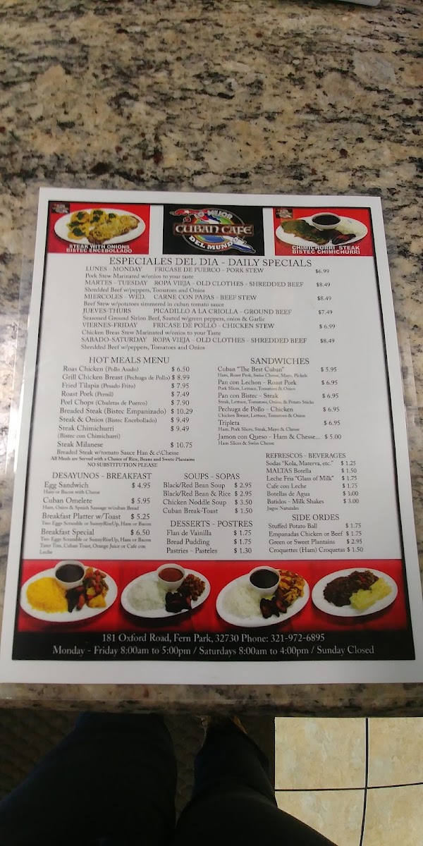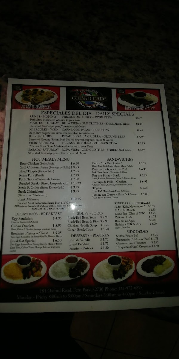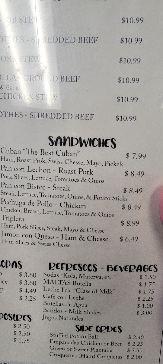 Expect to find classic Cuban sandwiches and hearty soups like chicken stew or black beans paired with rice, alongside satisfying hot plates such as roast pork or fried tilapia. These dishes invite a leisurely meal that fits well with the welcoming, family-oriented atmosphere of the restaurant.