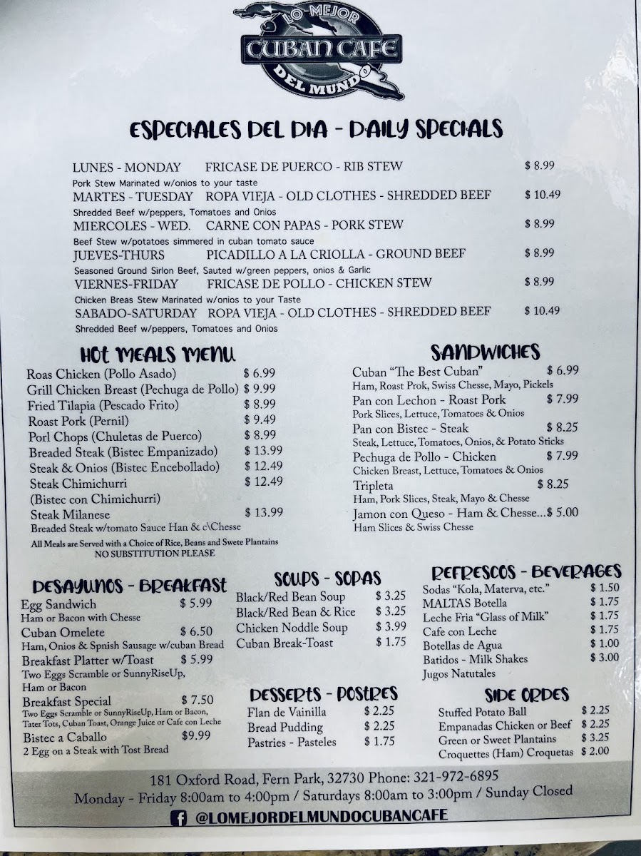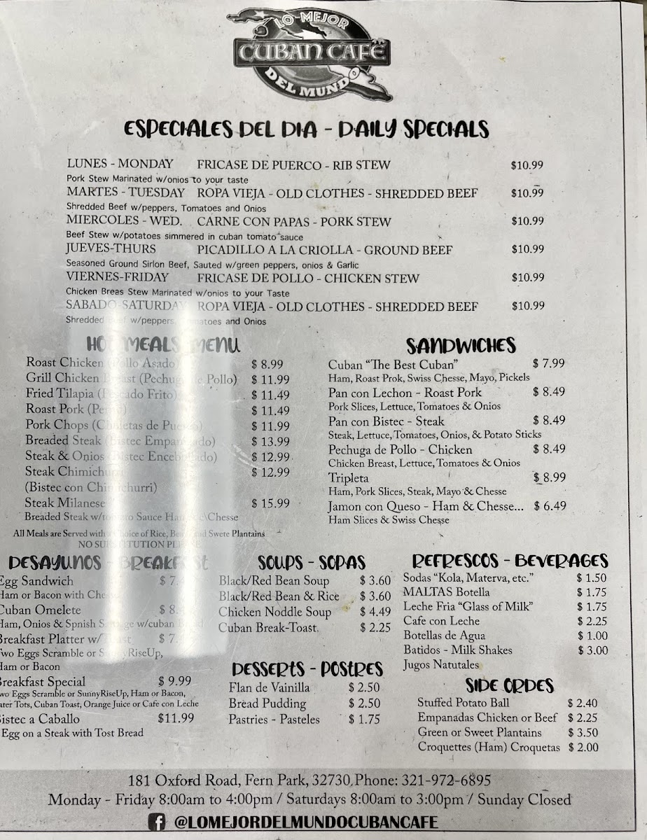 The menu at Lo Mejor Del Mundo Cuban offers a straightforward and inviting selection that captures the warmth and tradition of Cuban home cooking. It’s a place where simple, comforting dishes are the focus—perfect for casual lunches or relaxed dinners with family and friends.